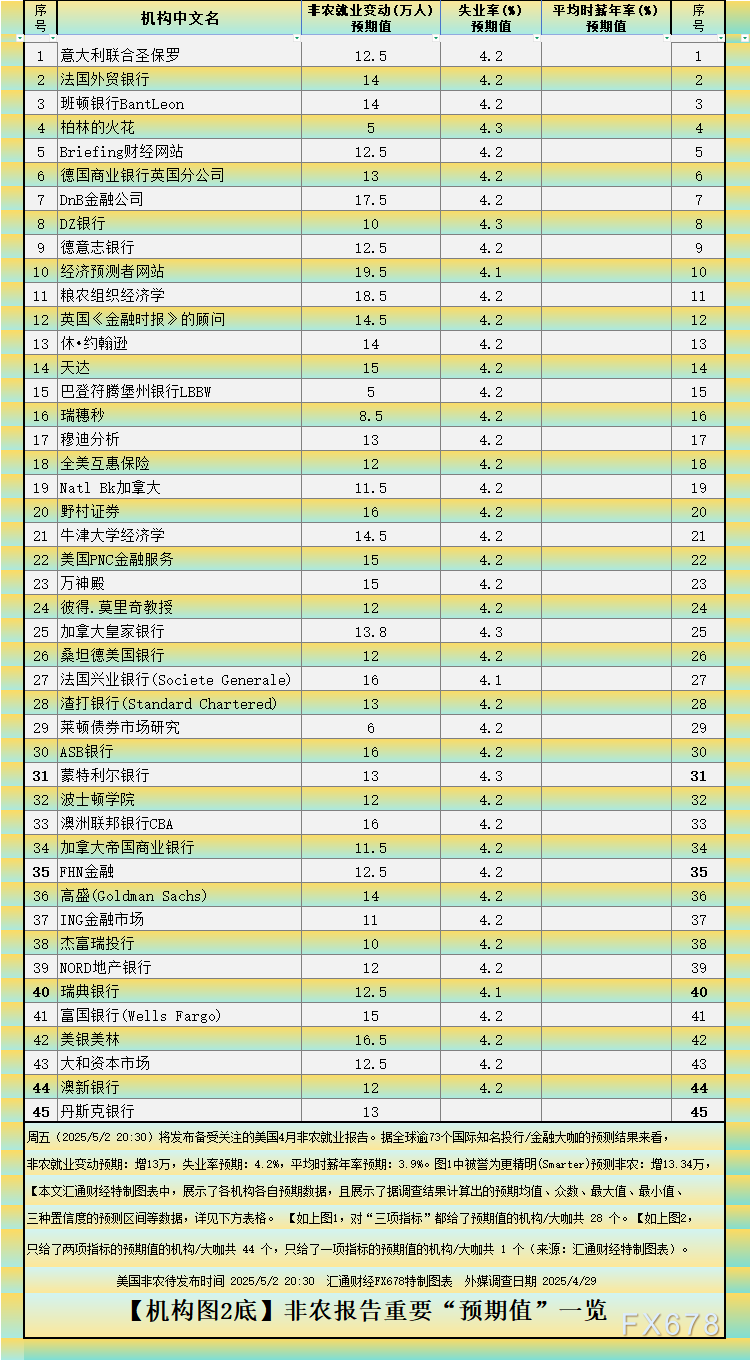汇通财经APP讯——周五(2025/5/2 20:30)将发布备受关注的美国4月非农就业报告。据全球73个国际知名投行/金融大咖的预测结果来看,非农就业变动预期:增13万,失业率预期:4.2%,平均时薪年率预期:3.9%。但值得注意的是:图1中被誉为更精明(Smarter)预测非农:增13.34万。虽然,13.34万比13万大不了多少,但是上次预期也是类似情况,但结果非农发布值比预期高出很多。