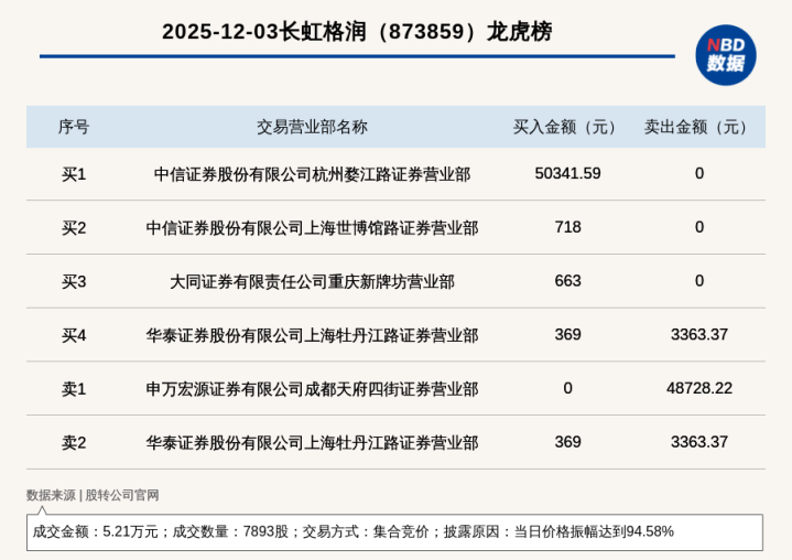 每经讯,2025年12月3日,新三板创新层公司长虹格润(873859能加杠杆的炒股软件,收盘价:6.63元)登上龙虎榜,交易方式是集合竞价,披露原因是当日价格振幅达到94.58%,成交数量7893股,成交金额5.21万元。买一席位为中信证券股份有限公司杭州婺江路证券营业部,买入5.03万元;卖一席位为申万宏源证券有限公司成都天府四街证券营业部,卖出4.87万元。